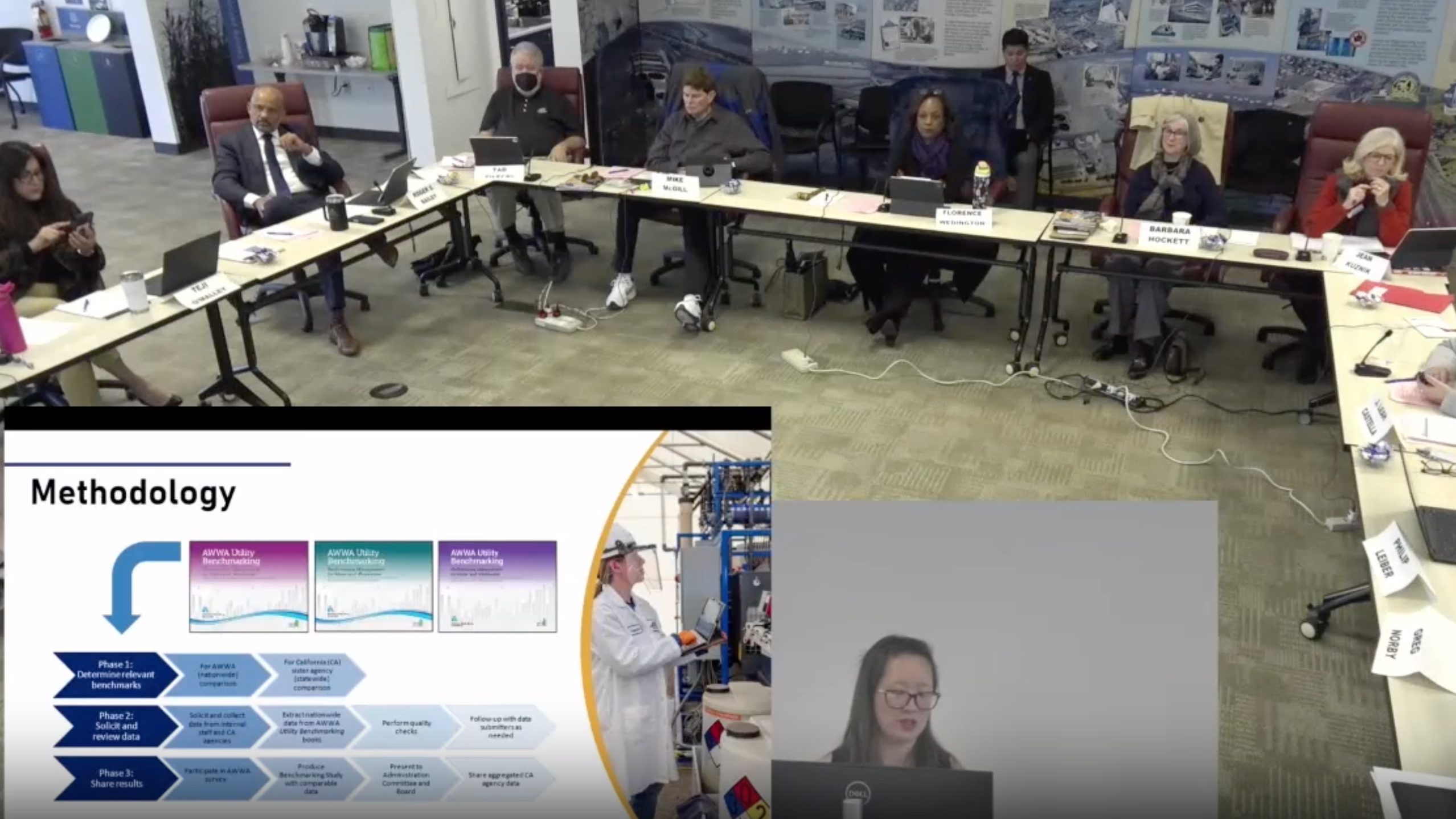 Christina G. presented the District's comprehensive benchmarking study comparing Central San's performance across 86 indicators (40 benchmark categories) against statewide California agencies and nationwide data from AWWA. Central San exceeded peer performance in 63% of benchmarks. The study used AWWA's Utility Benchmarking framework and included a California-specific survey distributed through CAFA and BACWA. Data limitations include subjective definitions, varying agency operating types, and limited California agency participation (8-9 respondents). Central San has unique characteristics including cogeneration, multiple hearth furnace solids handling, and recycled water production. Phil Leiber and General Manager Roger Bailey praised Christina's work and emphasized benchmarking as a key tool for demonstrating value to customers and informing budget decisions. The District plans to share aggregated California data with participating agencies to encourage broader participation.