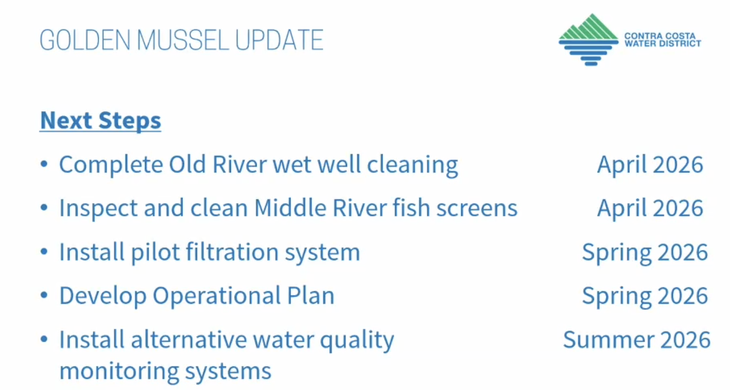 Water Operations Manager Daniel McVeigh reported golden mussels have spread to all CCWD intakes and Los Vaqueros Reservoir, with $925K in response costs this fiscal year and new pilot filtration and UV treatments underway.