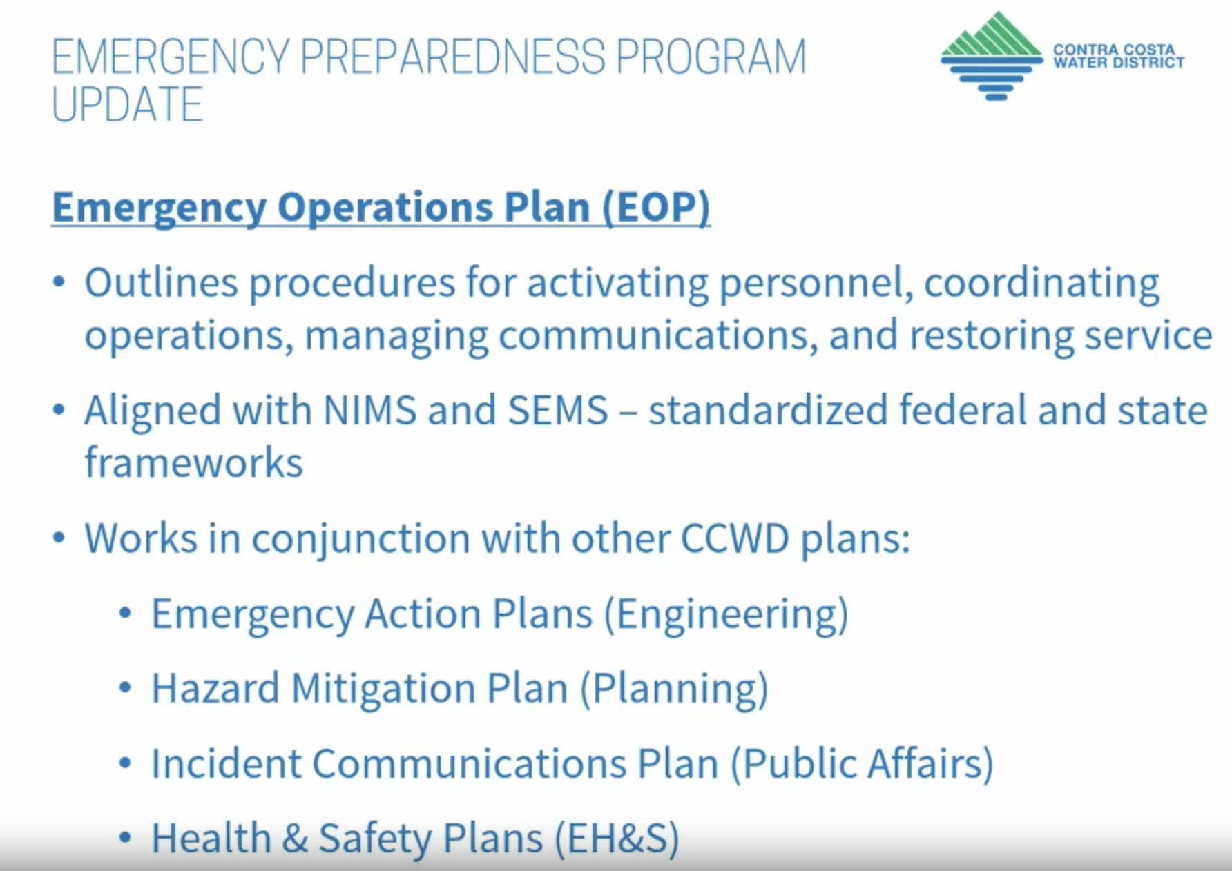 Regular Board of Directors meetings are held on Wednesdays at 6:30 PM (see CCWD calendar for exact dates).